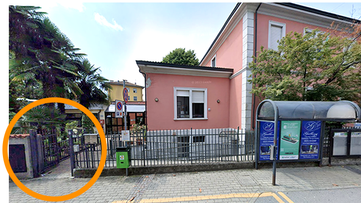 Ci troviamo nell’edificio dove hanno sede anche il Distretto Socio-Sanitario e i Medici di Base, ma si entra dal cancello sulla sinistra (nella foto evidenziato dal cerchio) e si scende al piano -1 (sulla destra , accessibile tramite rampa).